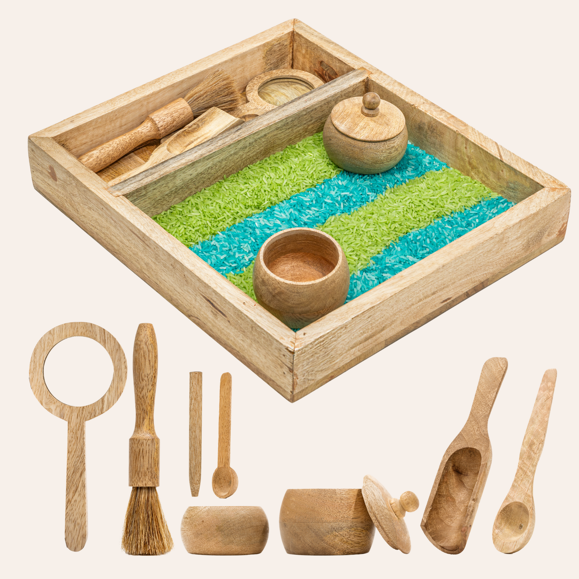Wooden Sensory Bin Set – Montessori Rectangle Tray with Tools & Bowls